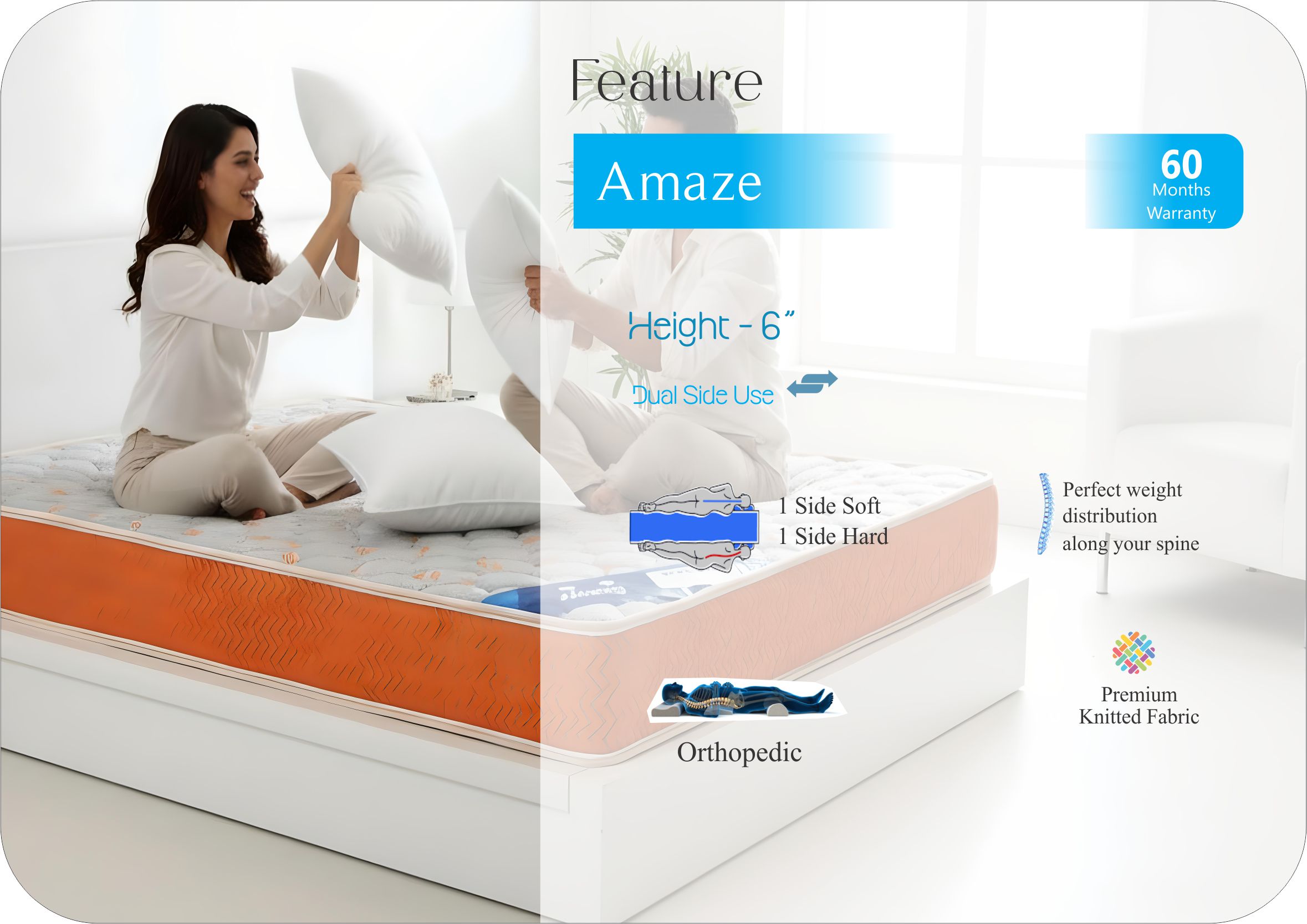 Introducing the Sleepnjoy AMAZE Mattress – a perfect blend of luxury, support, and innovation. Crafted with 4 premium comfort layers and wrapped in ultra-soft knitted quilted fabric, this mattress is thoughtfully designed for deep rest, back support, and dual comfort – soft on one side, medium on the other.