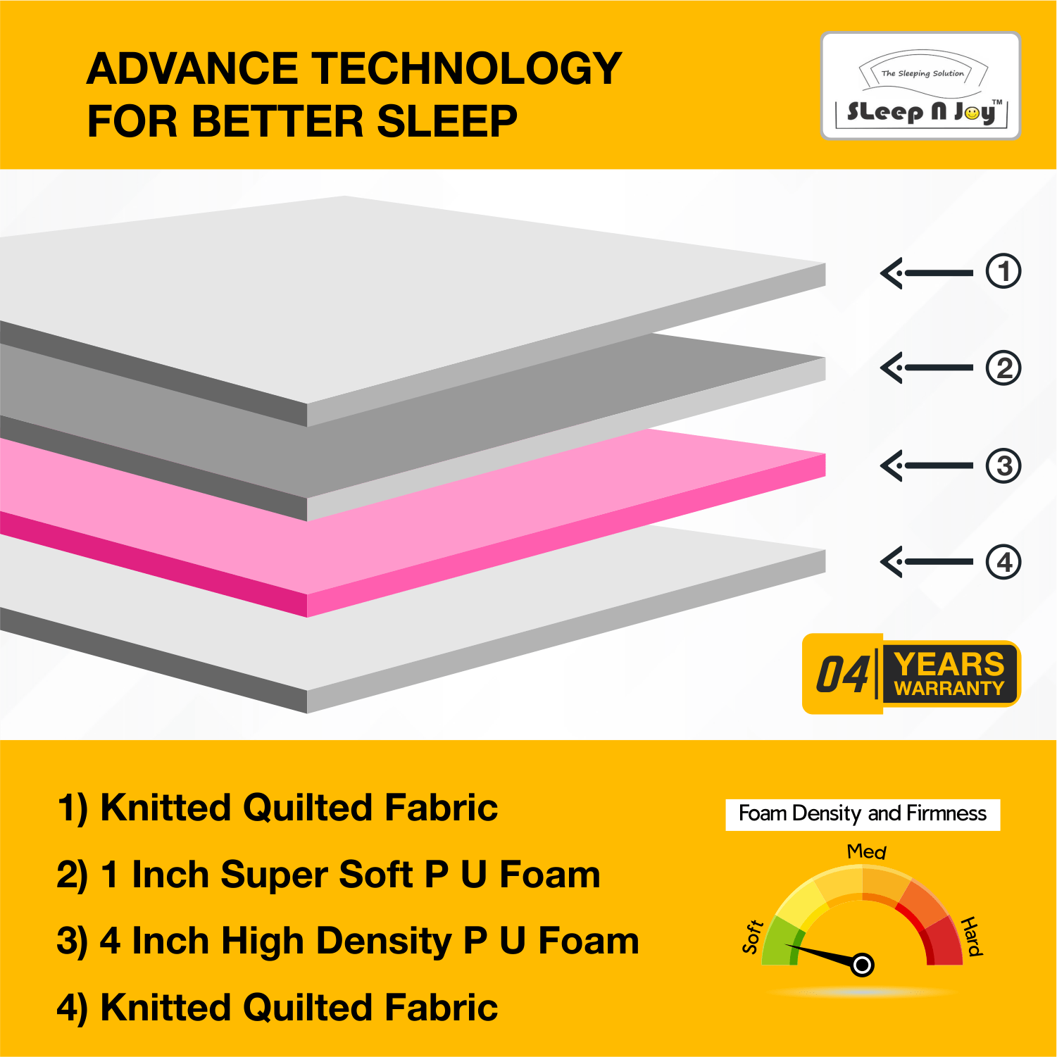 Indulge in deep, supportive sleep with the Sleepnjoy GOLDLINE Mattress – designed for those who love a soft yet supportive feel. With its plush knitted quilted top, 5-inch high-density PU foam core, GOLDLINE offers a perfect blend of comfort, durability, and stability. Ideal for everyday luxury at an affordable price.